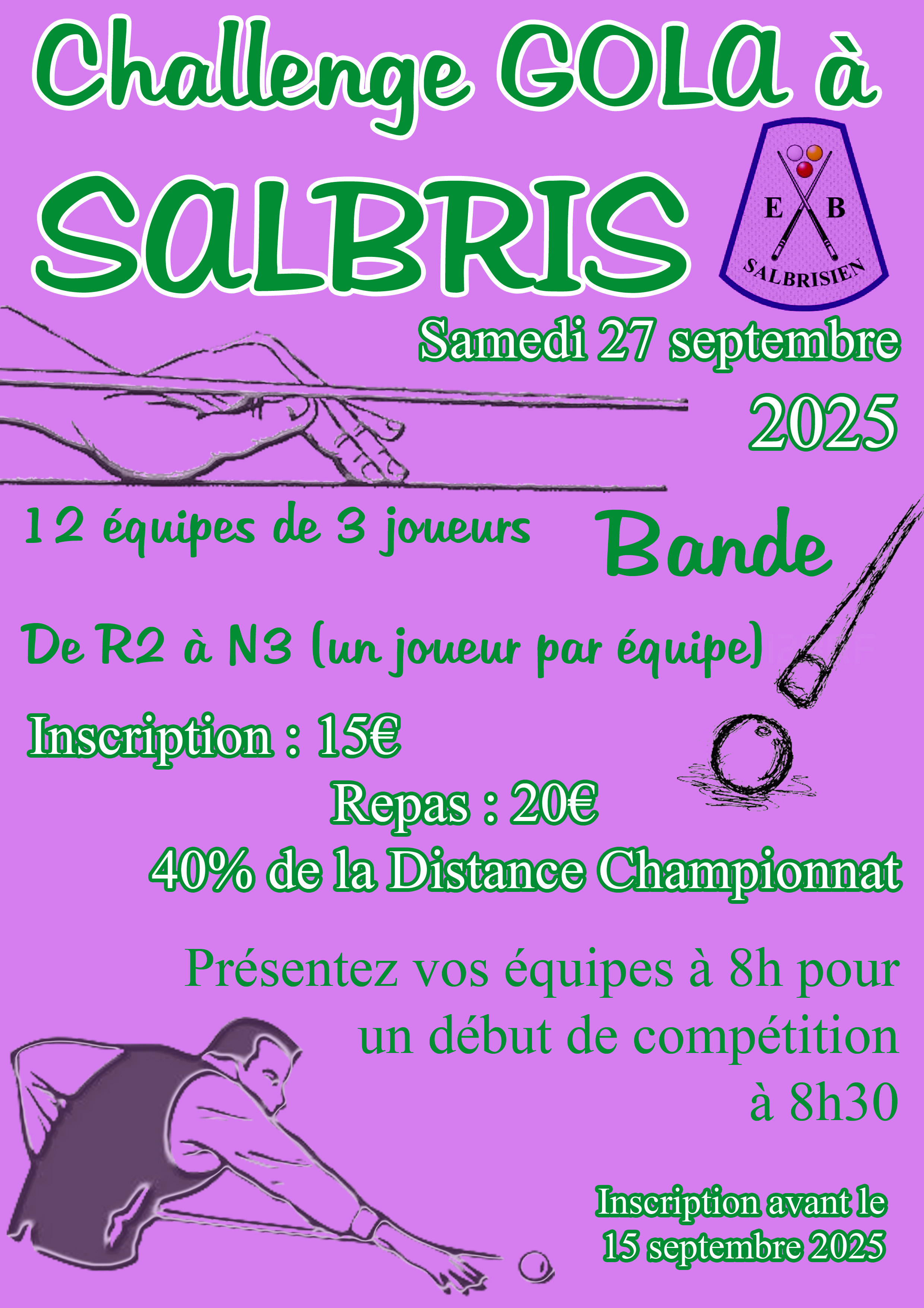 L'Entente Billard Salbrisien organise son traditionnel tournoi à la bande "La Coupe Christian Gola" le SAMEDI 27 SEPTEMBRE 2025. Inscrivez vous soit par Mail assobillards@gmail.com soit par téléphone. 02 54 88 27 97