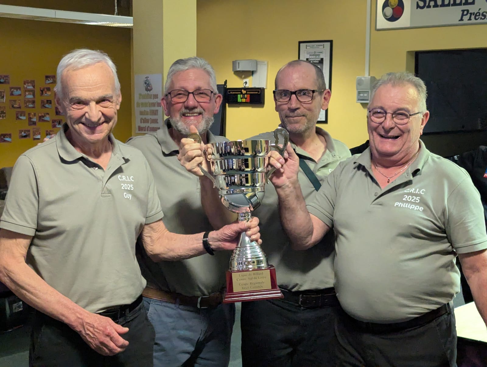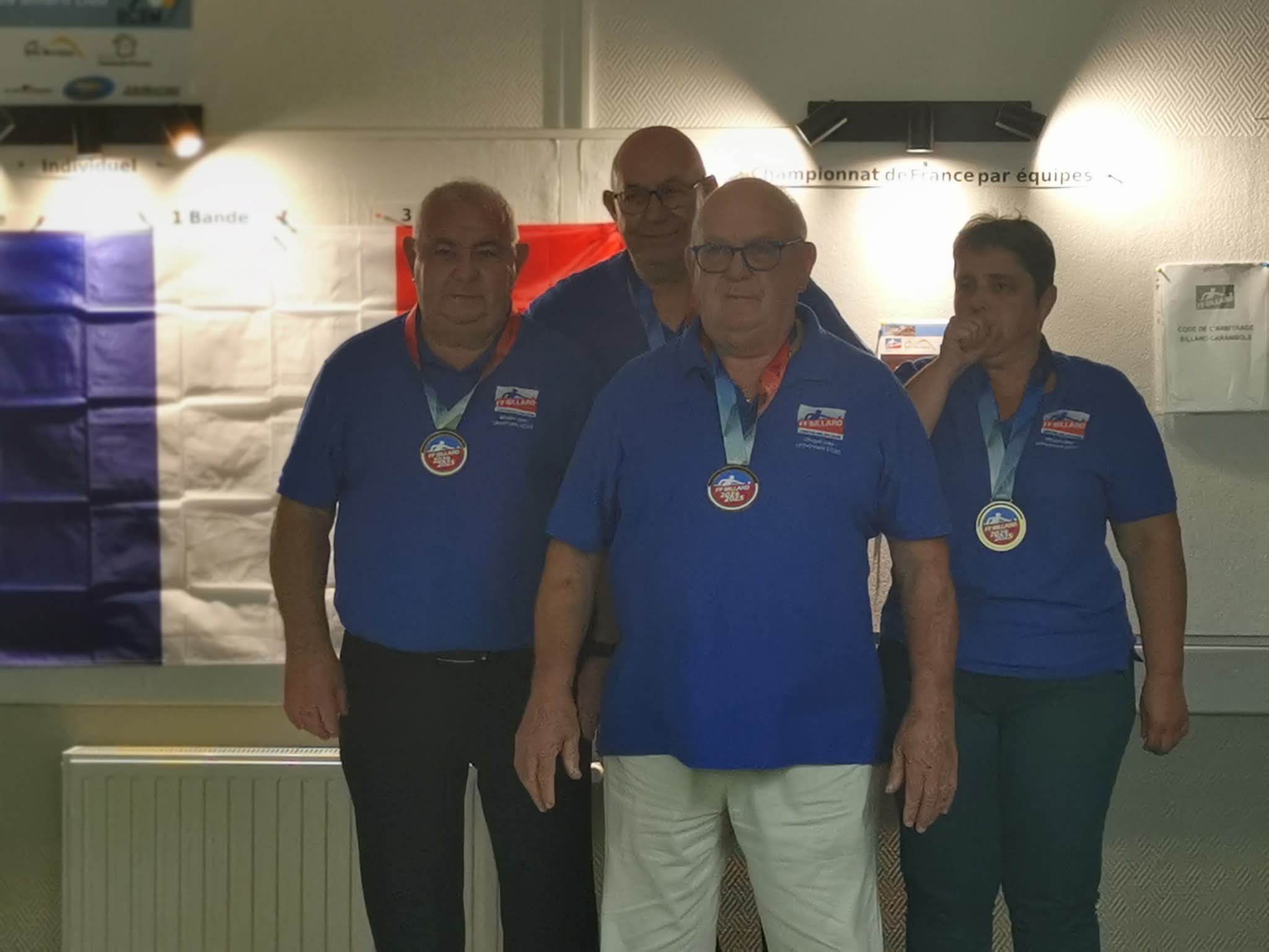 Dès Jeudi 26 Juin, l'équipe pour la Coupe des Provinces 2025 de la LBCVL, composée de Jean-Michel Auvray (Libre R1-Lucé), Florence Maillet (Libre R2-St Pierre), Jacques Coursault (1 Bande R1 - Val d'Amboise) et Francis Vautelin (3 Bandes R1 -C'Chartres) s'est déplacée à Billy le Montigny pour y discputer le titre de Champion de la Coupe des Provinces. A l'issue de la phases des poules, l'equipe de la LBCVL sortait vainqueur de leur poule. Les 1/4 de Finale les opposait à l'équipe de Bourgogne Franche Comté. A noter la belle performance de Jacques lors des ces 1/4 Finales où Jacques termine son match en 10 reprises accompagné d'une série de 32!! permettant ainsi à son équipe de ne pas être éliminéé et encore mieux, de se qualifier pour les 1/2 Finales synonyme d'une médaille assurée. L'équipe de la LBCVL n'aura pas pu rivaliser avec l'équipe de la Nouvelle Aquitaine qui sera déclarée Championnat de France quelques heures plutard.