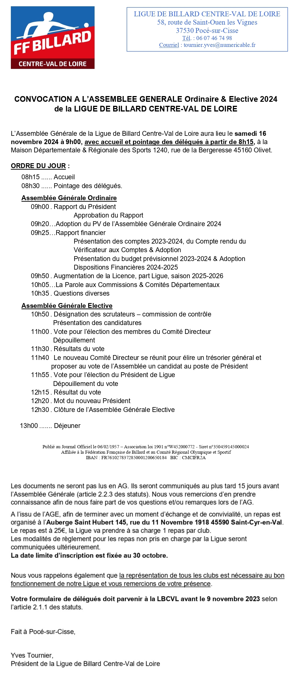 Veuillez trouver ci-joint la convocation T1 3 Bandes N2 (Edition N°2 : ATTENTION POULE A ET B LE SAMEDI 19 OCTOBRE A BLOIS . 20 OCTOBRE 2024 pour les Poules C, D, E, F, G, H. Début des rencontres 9H